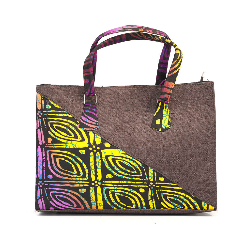 Botswana, the brown, purple and yellow ankara tote; black velvet inner lining with inner zipless side pocket. Your very handy and practical multi-purpose handbag. Perfect for the office; also great as a carry-all for that overnight stay or long weekend away.