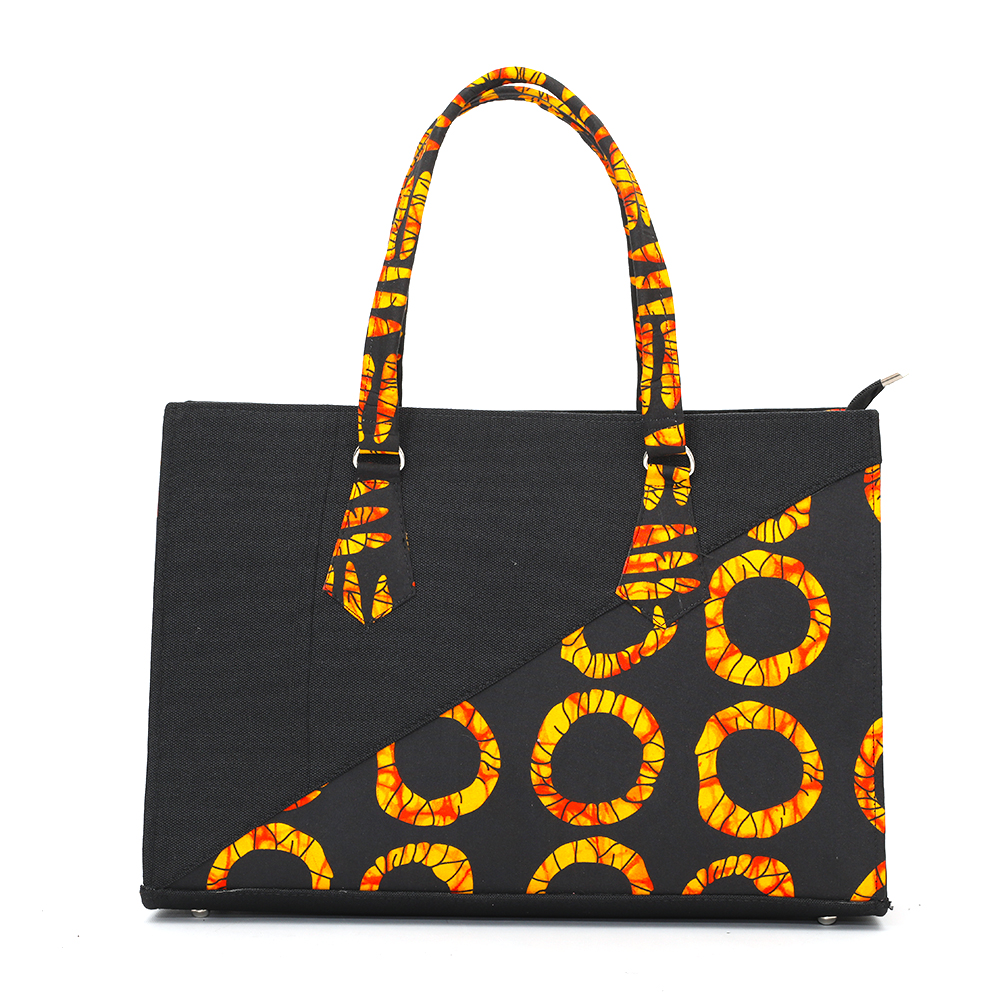 Conakry, the black ankara tote, with black velvet inner lining and inner zipless side pocket. Your very handy and practical multipurpose tote. Perfect for the office; also great as a carry-all for that overnight stay or long weekend away.