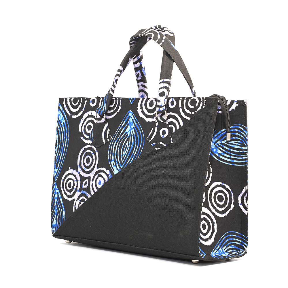 Gabon, the denim/black, white and blue ankara tote; black velvet inner lining with inner zipless side pocket. Your very handy and practical multi-purpose tote. Perfect for the office; also great as a carry-all for that overnight stay or long weekend away.