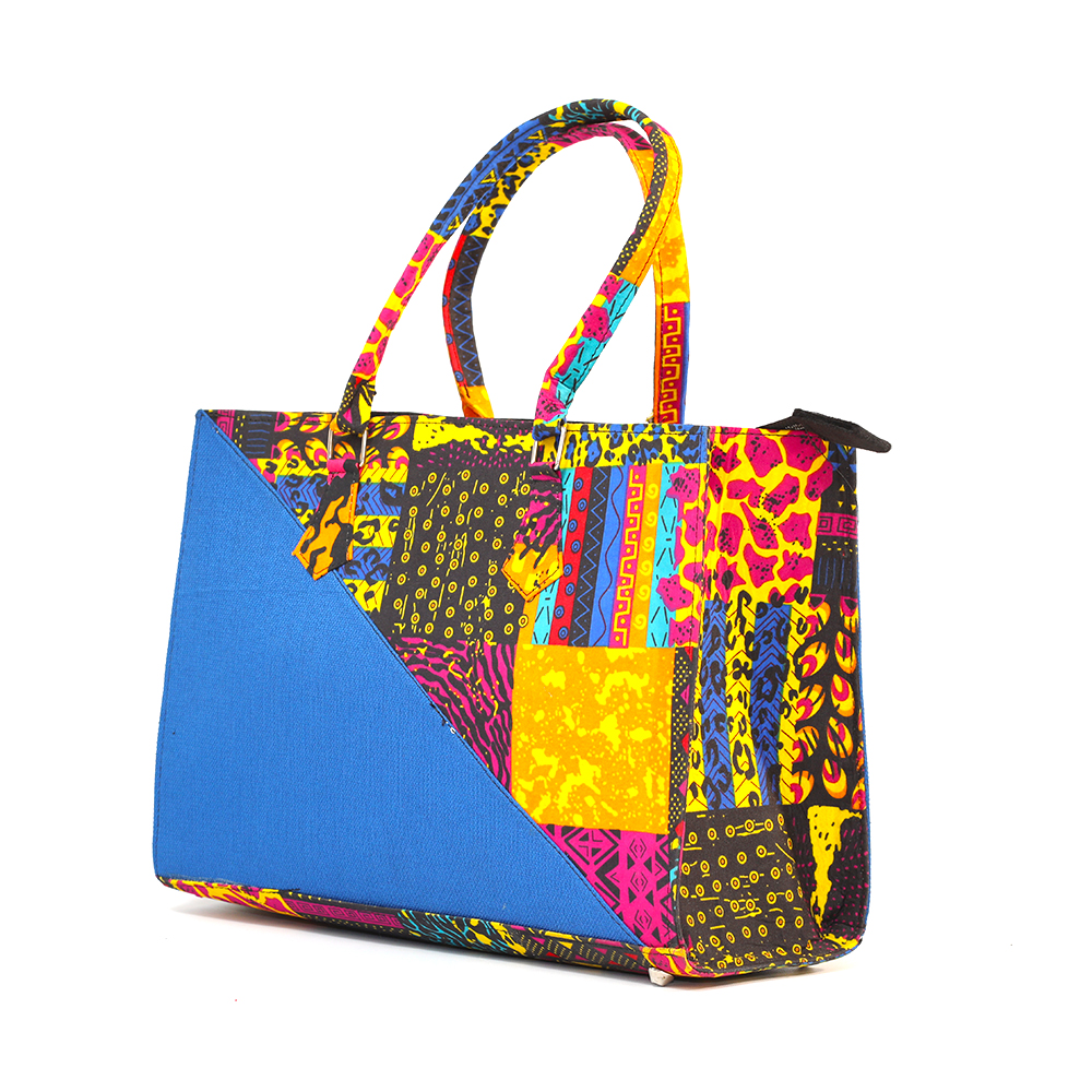Guinea Bissau, the blue and multicolour ankara tote; black velvet inner lining with inner zipless side pocket. Your very handy and practical multi-purpose tote. Perfect for the office; also great as a carry-all for that overnight stay or long weekend away.