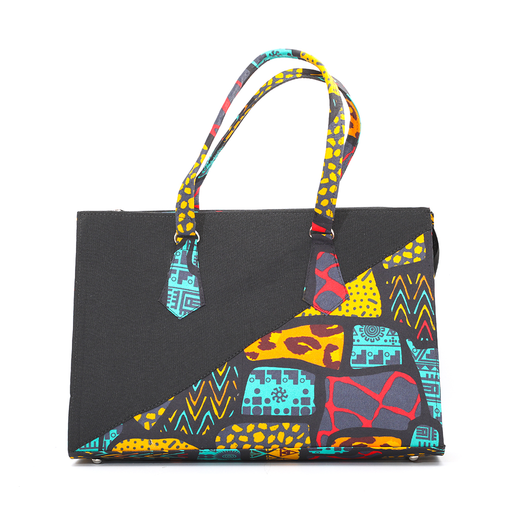 Madagascar, the black ankara tote; black velvet inner lining with inner zipless side pocket. Your very handy and practical multi-purpose tote. Perfect for the office; also great as a carry-all for that overnight stay or long weekend away.