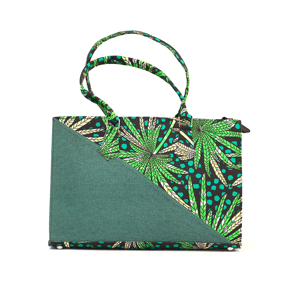 Niger, the green ankara tote; black velvet inner lining with inner zipless side pocket. Your very handy and practical multi-purpose tote. Perfect for the office; also great as a carry-all for that overnight stay or long weekend away.