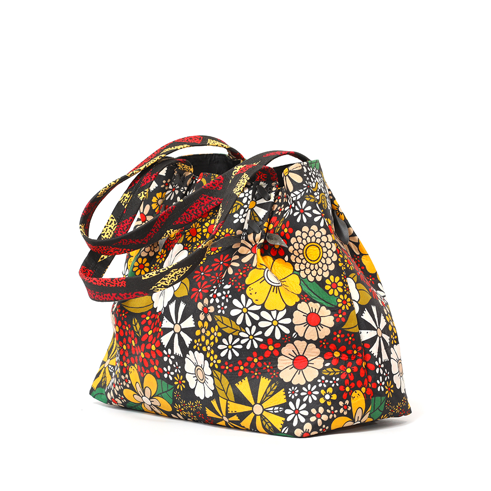Praia, the floral multicolour ankara bucket; black velvet inner lining with inner zipless side pocket. Your very handy and practical multi-purpose handbag. Perfect for the office; also great as a carry-all for that overnight stay or long weekend away.