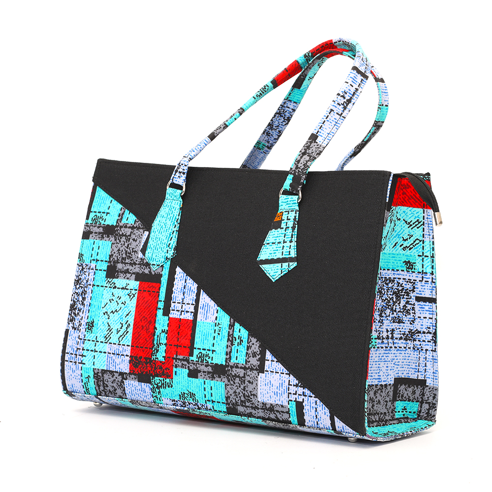 Senegal, the denim/black and multicolour ankara tote; black velvet inner lining with inner zipless side pocket. Your very handy and practical multi-purpose tote. Perfect for the office; also great as a carry-all for that overnight stay or long weekend away.